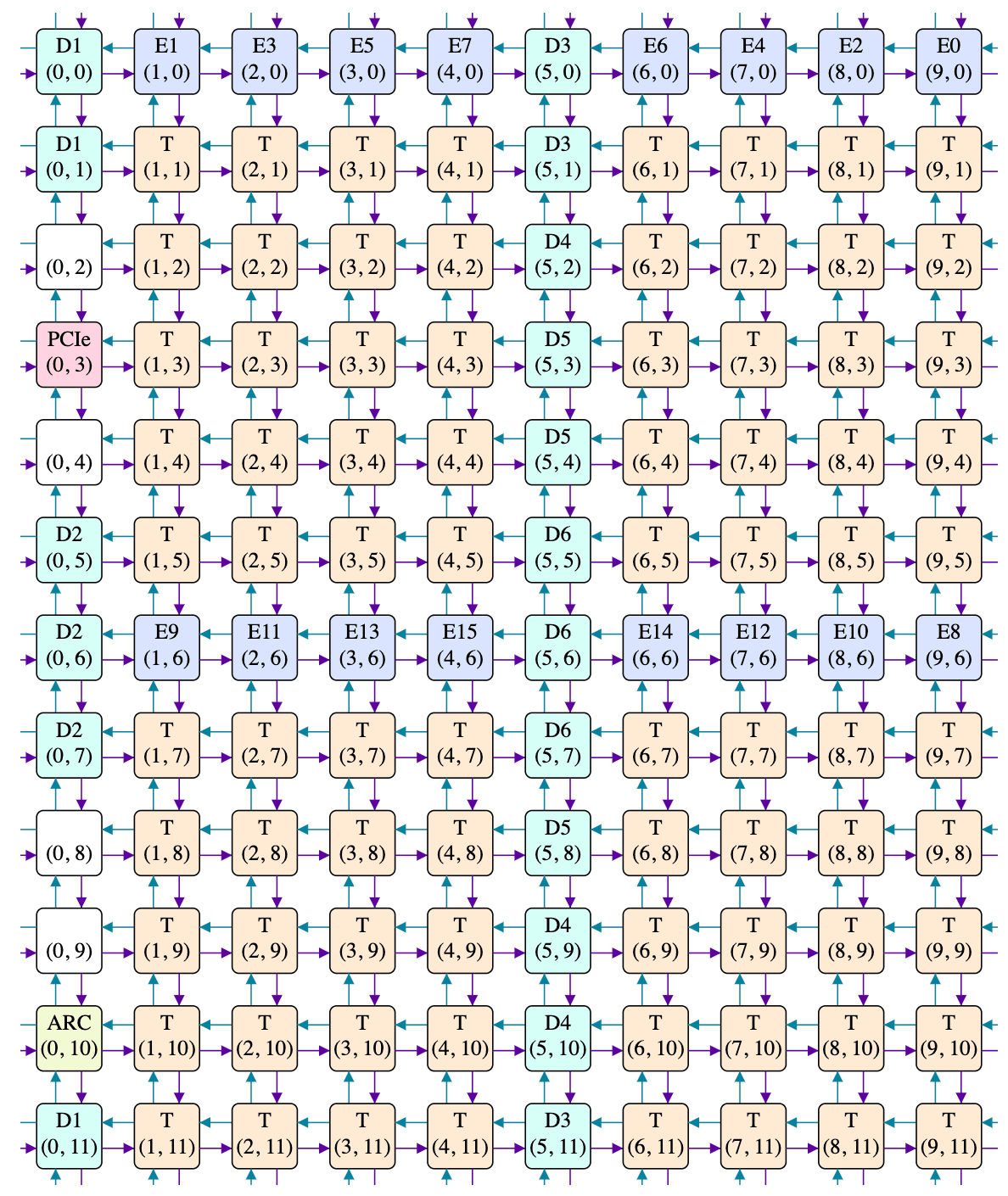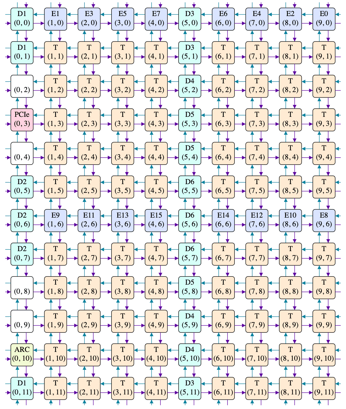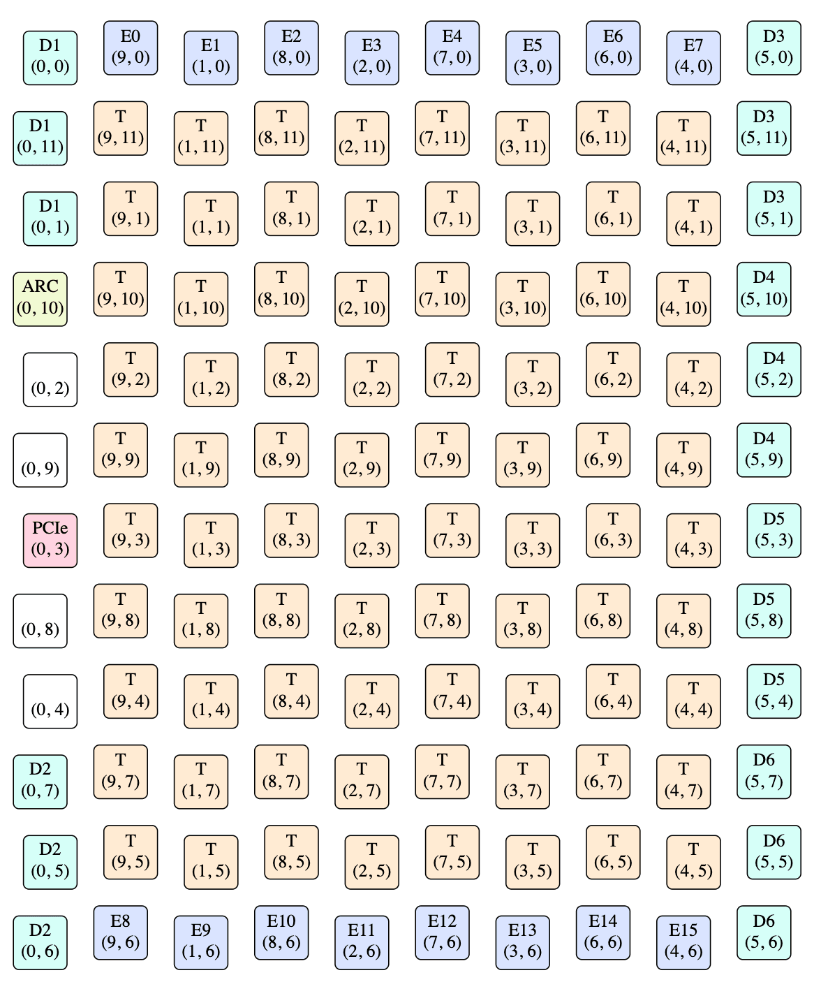 The various tile-to-tile connections aren't shown on the above, as it would be a horrible mess of overlapping and dodging lines. It does however match the circuit board photos: the DRAM tiles are on the left and right edges, and tiles routing to the same DRAM chip are adjacent (e.g. the three D5 tiles are physically adjacent, even though their logical Y coordinates are 3, 8, 4). The ethernet tiles also end up on the physical edges, which makes sense. Thankfully, software mostly doesn't need to worry about this interleaving (except for HARVESTING_NOC_LOCATIONS