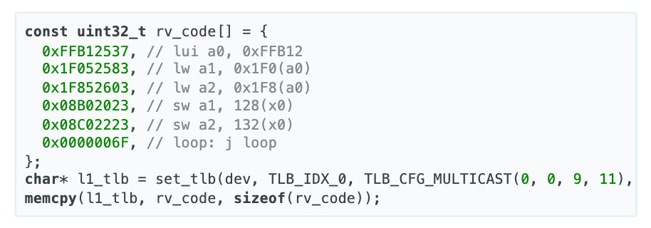 With all the cores held in soft-reset, it is safe to send them new code. The SRAM (or, for D tiles, DRAM) within a tile starts at tile-local address 0, and execution will also start at address 0 when soft-reset is cleared, so we can send some RISC-V code to tile-local addresses starting at 0, again multicasting it out. The code will read from the tile-local 64-bit cycle counter at 0xFFB121F0 and 0xFFB121F8, then write it to tile-local address 128: